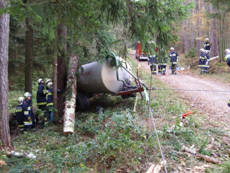 Ein Jauchenfass löste sich vom Traktor, der Lenker wurde bei Sicherungsmaßnahmen zwischen Baum und Fass eingeklemmt. So war die Annahme der Gemeindeübung am 07. November 2010 der Feuerwehren Natschbach und Loipersbach. Ausgearbeitet wurde die Übung durch die FF-Natschbach. Zu Beginn wurde das Fass durch 2 Greifzüge und einer Seilwinde gegen weiteres Abrutschen und Verdrehen gesichert. Erst danach war ein gefahrloses und sicheres Vorgehen zur verunglückten Person möglich. Mittels Hebekissen wurde das Fass vom Baum um einige Zentimeter weggedrückt, und dadurch die Person entlastet. Nun wurde das Jauchenfass durch einen Greifzug soweit aufgestellt , dass die Rettung der Person möglich war.
