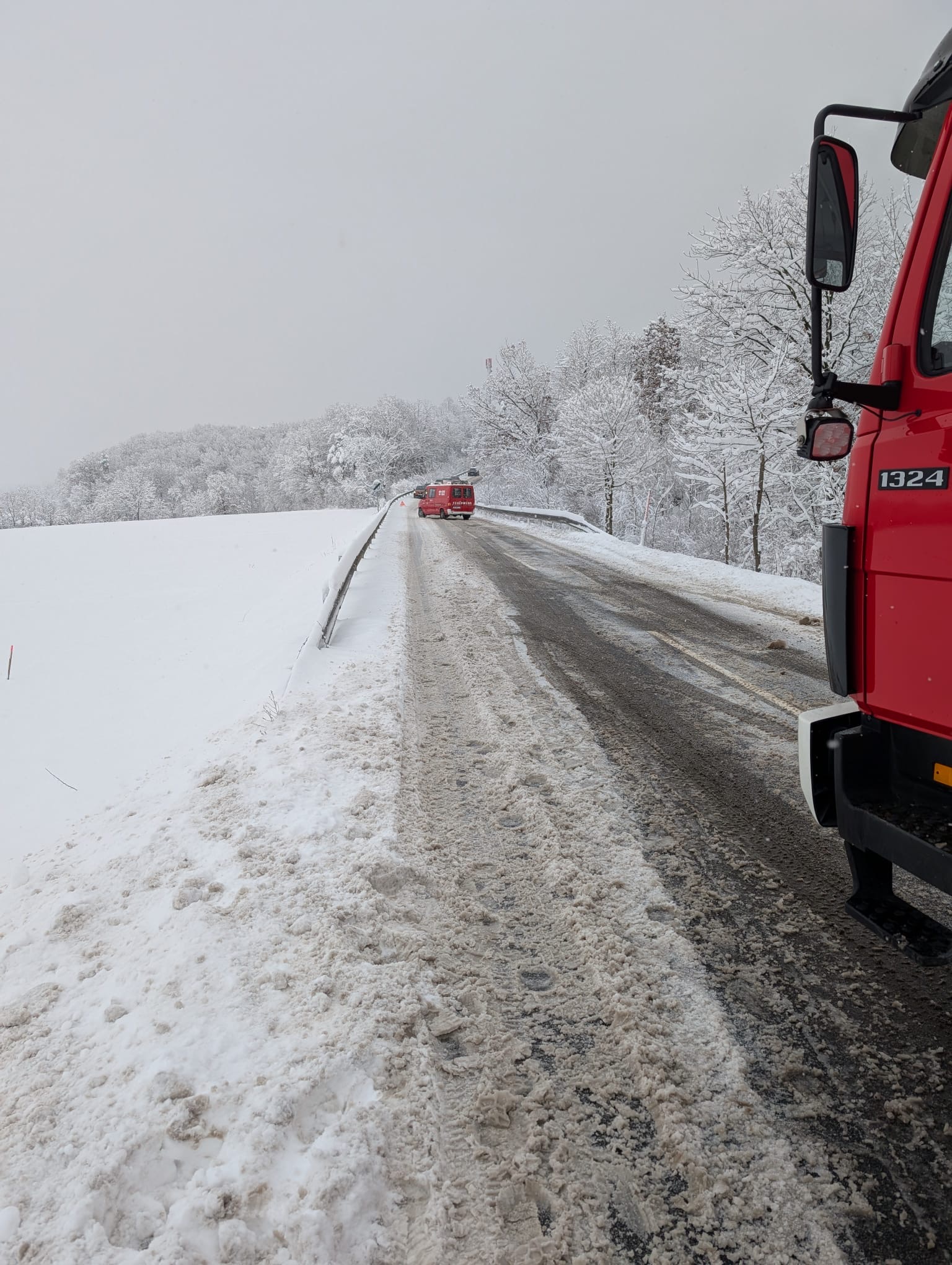 Nur wenige Stunden später folgte bereits der nächste Alarm: Ein kleiner Lkw war von der Fahrbahn abgekommen und auf der Kuppe einer steilen Böschung hängen geblieben. Auch hier machte der viele Schnee eine Selbstbergung unmöglich. Der Klein-Lkw wurde erneut mit der Seilwinde geborgen, zusätzlich jedoch seitlich mit einem Seil eines Traktors gesichert, um ein Abrutschen in die Böschung zu verhindern. Nach etwa 40 Minuten konnte auch dieser Einsatz erfolgreich abgeschlossen werden.